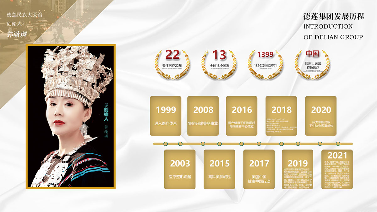 德莲医疗集团由郭潇璘女士与13位、国医大师以及医学博士企业家、联合创立,起源中国,服务世界。